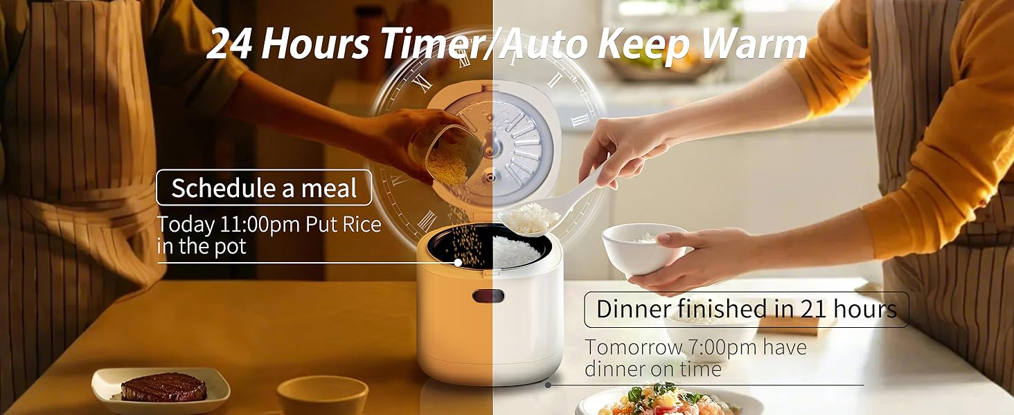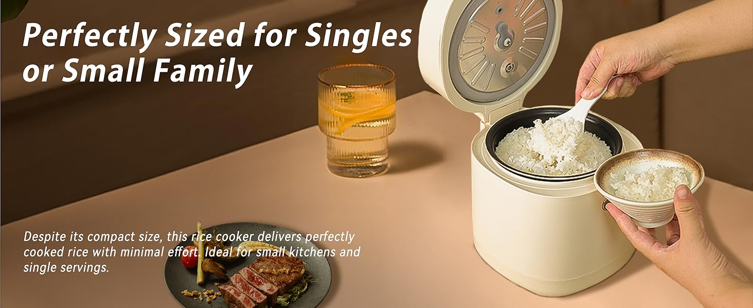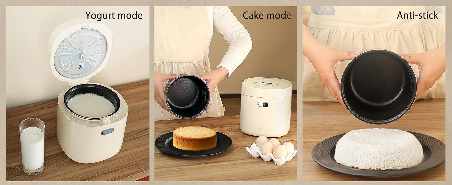【6 Cooking Modes & 24H Timer Delay & Keep Warm Function】This 3 cup rice cooker features six diverse cooking modes: Slow cooker, White Rice, Quick Cook, Brown Rice, Cake, and Yogurt. The preset function allows you to set cooking times ranging from 10 minutes to 12 hours, enabling flexible scheduling of meals. Additionally, the warm function ensures that cooked rice remains warm and delicious. After setting the timer, the rice cooks and maintains heat automatically until the meal is ready, making it ideal for busy families and those needing to prepare meals.