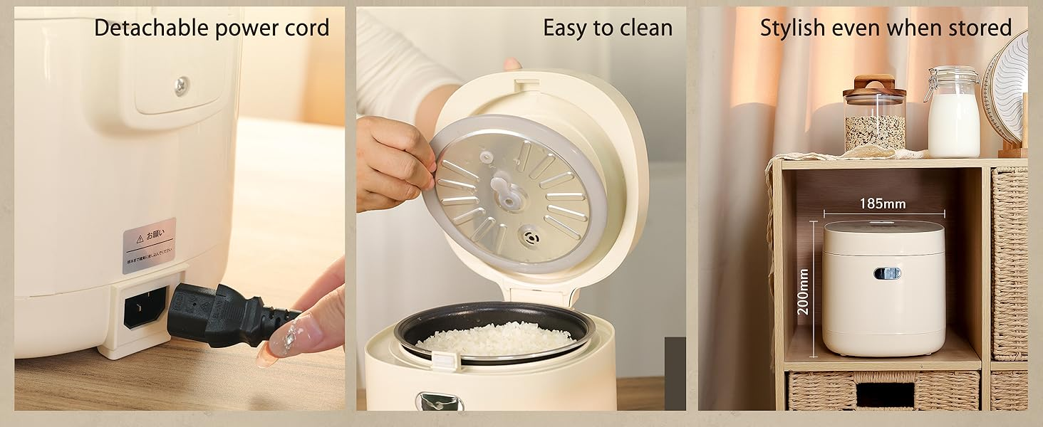 【1.5L Ideal Capacity】This 1.5L electric cooker is ideal for 1-3 people.Aluminum inner pan base has high heat conductivity for efficient cooking. The rice cooker measures 185*205*200mm, ensuring you have enough space for cooking. It can also be stored neatly in the kitchen or on a shelf.